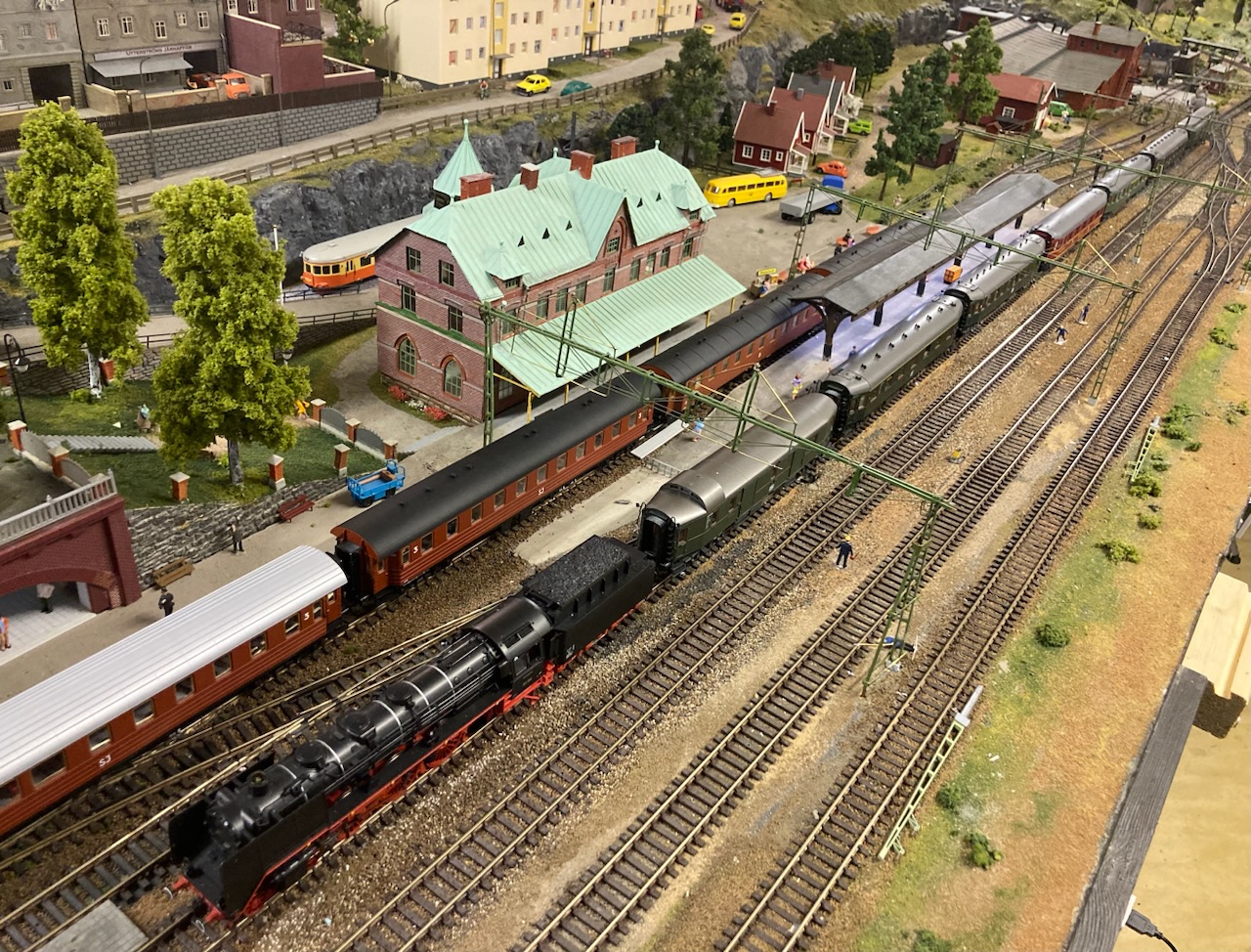 Föreningen huserar i en källarlokal i centrala Umeå. Träffas måndagar och torsdagar, och i måndags var det körkväll. Jag tog med mitt BR03 med godsvagn, fyra sittvagnar, en sovvagn och postvagn. Kul att få köra detta tågsätt på en anläggning där det verkligen får plats! Här ses det vid en av stationerna: