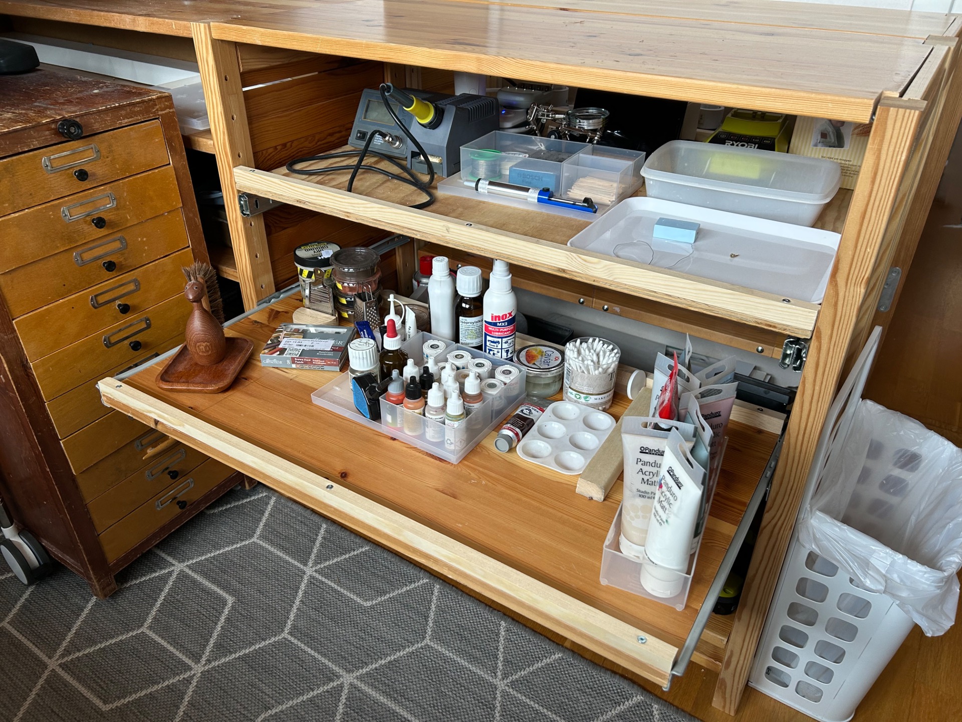Senaste tillskottet är två utdragbara hyllplan bredvid arbetsbordet. Det övre för bl.a lödstation, batteriladdare, och extra avställningsyta. Det undre för färger och måleritillbehör.