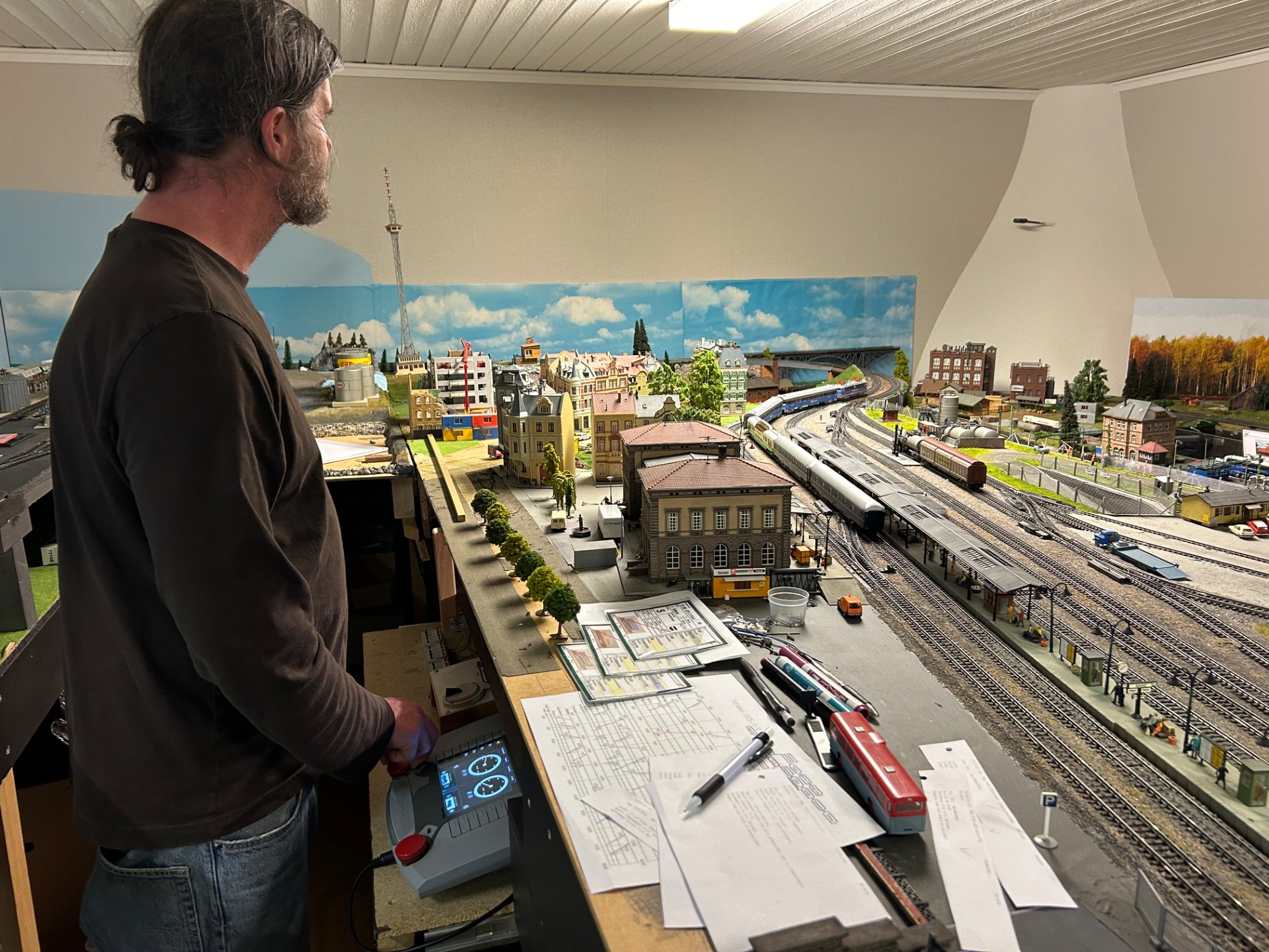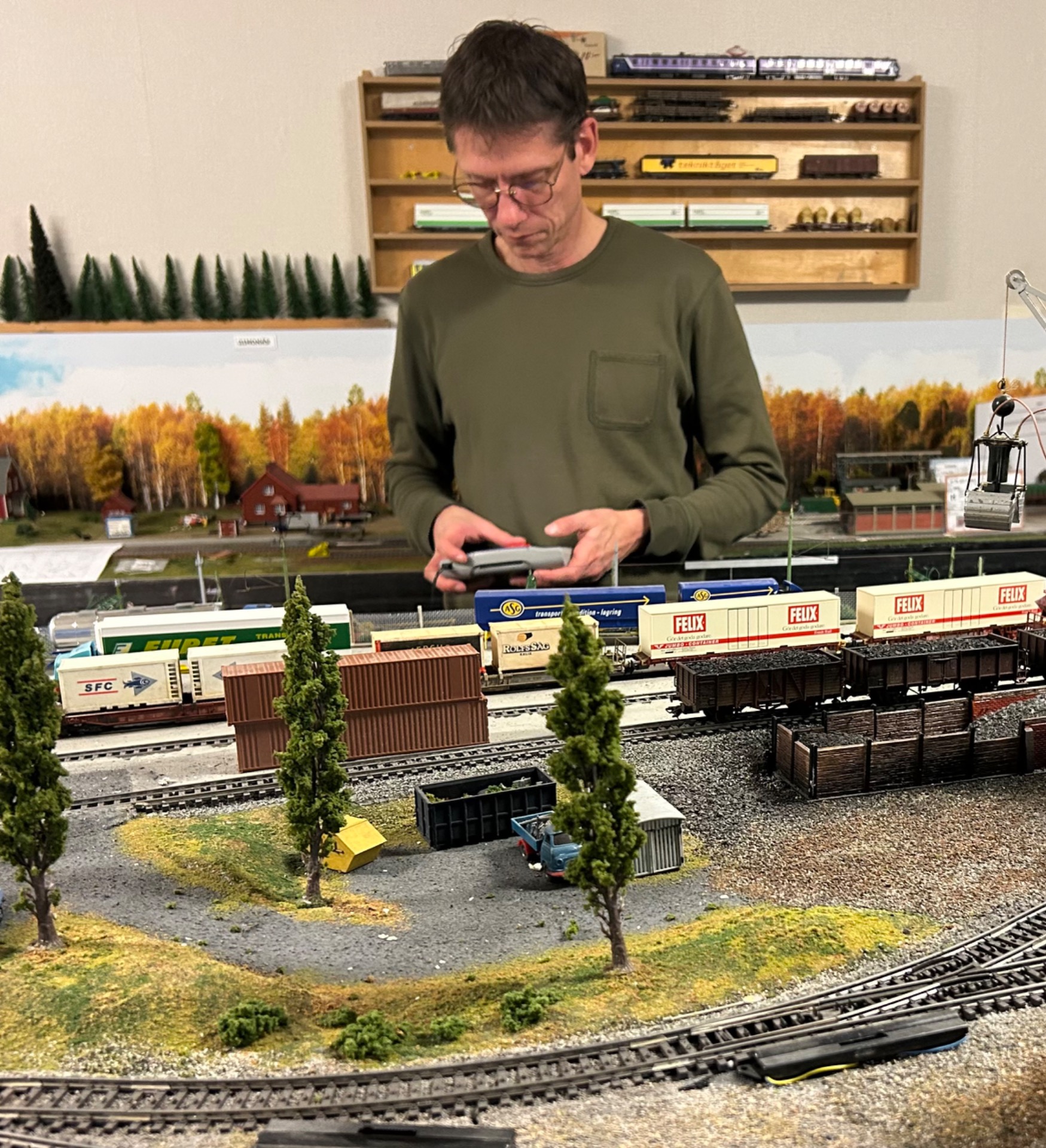 Johan hade förberett ett trafikspel med tidtabell, vagnskort och fraktsedlar. Totalt tio deltagare ägnade sedan ett par timmar åt körning och rangering med både persontåg och godståg. Vanligtvis kör jag tvåräls, men denna gång anmälde jag mig alltså för köruppdrag på treräls - omväxling förnöjer!