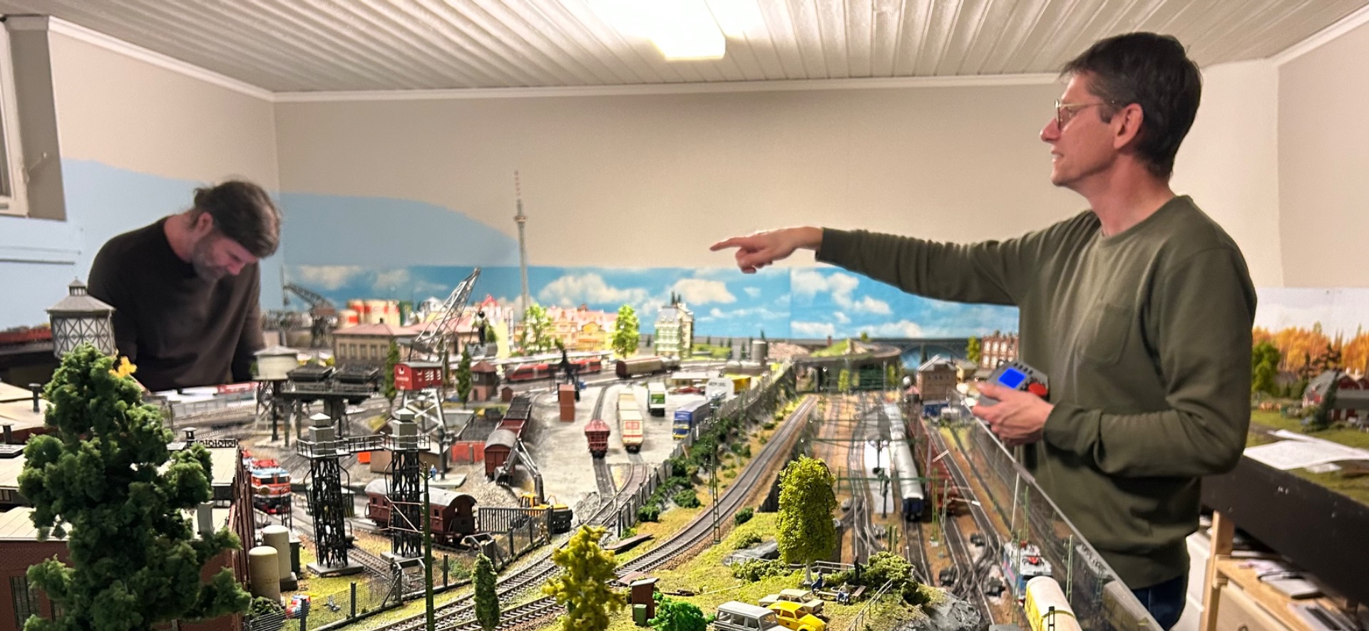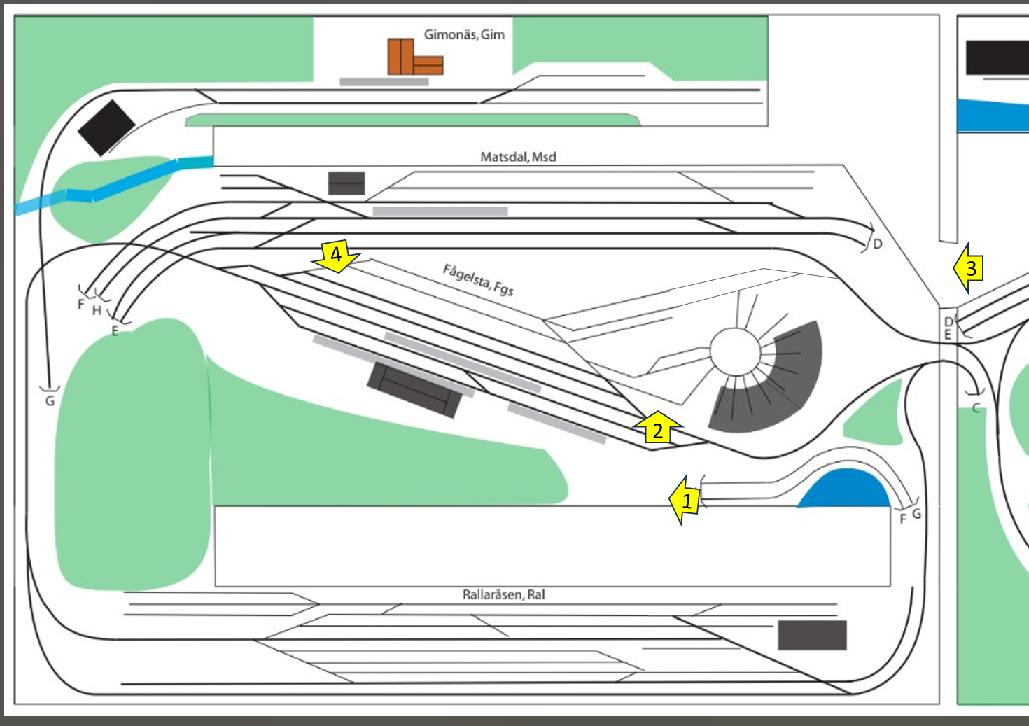 Umeå modelljärnvägsklubb har en anläggning i två delar, 2R respektive 3R. De flesta vagnar har isolerade hjulaxlar och kan således rulla på både tvåräls och treräls. Vagnsutbyte sker dels på stationen i Matsdal där det finns ett spår som kan kopplas omsöm för likström och växelström, samt på containerterminalen i Fågelsta där två isolerade spår ansluter anläggningens båda delar med varandra (se spårplan nedan).