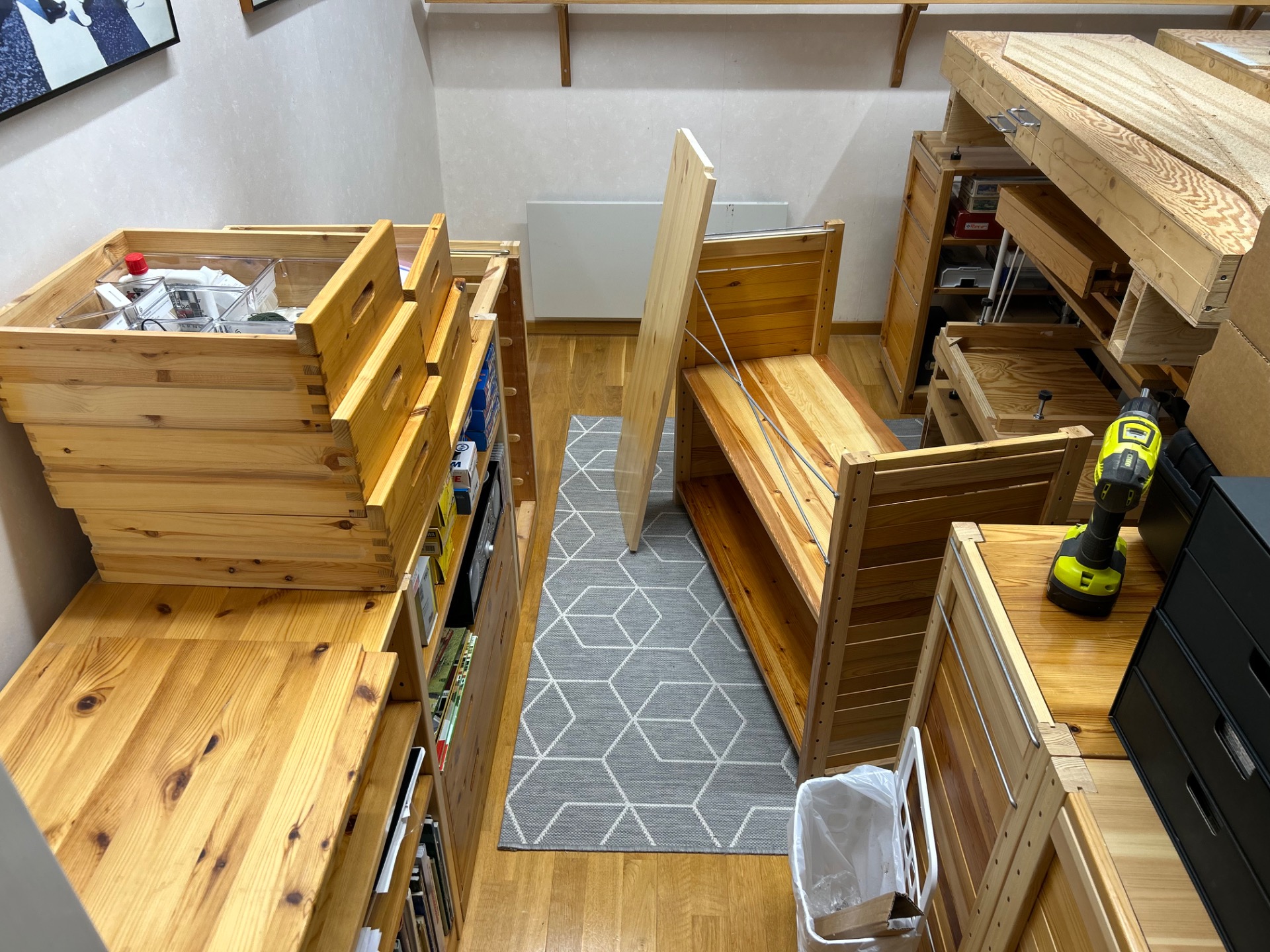 Och när jag kommit så långt insåg jag att tre minibyrå i bredd blir 96 cm - skulle passa perfekt i en hyllsektion som är 97! Tur då att jag har Universalhyllan med många olika hyllstorlekar, så det var bara till att bygga om:
